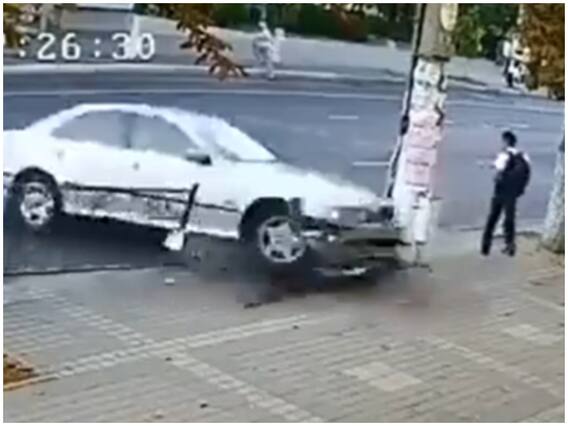 आप वायरल वीडियो में देखेंगे कि जिस जगह ये शख्स चंद सेकेंड पहले खड़ा हुआ था, वहीं अचानक एक तेज रफ्तार कार आकर दुर्घटनाग्रस्त हो जाती है. ये कार सीधा रेलिंग को तोड़ते हुए इलेक्ट्रिक पोल से टकरा जाती है. इस शख्स की जान बाल-बाल बचती है.