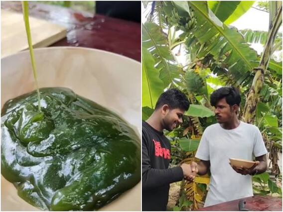 वायरल हो रहे वीडियो में एक शख्स केले के बगीचे के बीच उसकी पत्तियों को काट कर उसे छोटे-छोटे टुकड़ों में काटते देखा जा रहा है. जिसके बाद वह पत्ती के टुकड़ों को पीसकर पतला पेस्ट बना लेता है. फिर वह उसे एक बर्तन में छानकर निकालता है. जिसमें वह पीसी हुई चीनी को मिलाता है और फिर बर्तन में रखकर उसे पकाना शुरू कर देता है. जैसे-जैसे हलवा पकता जाता है उसका पानी भाप बनकर उड़ जाता है और बर्तन में हरे रंग का गाढ़ा पेस्ट बच जाता है.
