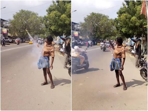 आमतौर पर दिवाली के समय छोटे बच्चों को रॉकेट चलाते देखा जाता है. जो रॉकेट चलाते समय उससे दुरी बनाकर रखते हैं. जिससे की वह आग की चपेट में नहीं आएं. वहीं इन सबके उलट एक शख्स को अपनी लुंगी में रखे रॉकेट को एक के बाद एक कर चलाते देखा जा सकता है. जिसे देख हर किसी को काफी हैरानी हो रही है. वहीं इसी दौरान उसकी लुंगी में कुछ और रॉकेट को फंसा हुआ देखा जा रहा है.