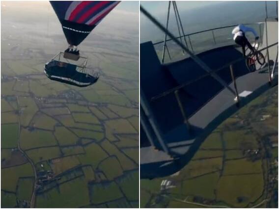 हाल ही में एक ऐसा रोंगटे खड़े कर देने वाला वीडियो सामने आया है, जिसमें एक शख्स को साइकिल पर इतना खतरनाक स्टंट करते देखा गया. जिसकी कल्पना भी कर पाना आसान बात नहीं है. सोशल मीडिया पर सामने आई वीडियो में हमें एक शख्स हवा में सैकड़ों फीट की ऊंचाई पर हवा में उड़ने वाले गुब्बारे से लटक कर प्लेटफॉर्म पर साइकिल पर स्टंट करते नजर आ रहा है. जिसे देख यूजर्स के रोंगटे खड़े हो गए हैं.