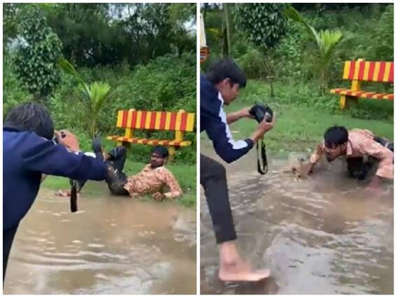 इस बीच एक युवक गंदे पानी में अलग-अलग पोज में फोटोशूट कराते देखा जा रहा है. इस दौरान शख्स पानी के ऊपर जोर से कूदते फिर उसमें लेट कर पोज देते देखा जा रहा है. शख्स इसके बाद भी नहीं रुकता है और वह अपने हाथों पर खड़ा होकर स्टंट करते हुए फोटोशूट कराता है. सोशल मीडिया पर इस फनी वीडियो को काफी देखा जा रहा है.