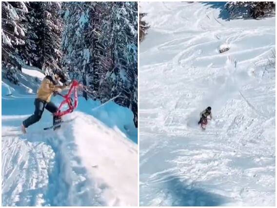 वायरल हो रहे वीडियो में एक शख्स को बर्फ पर स्कीइंग करने के लिए साइकिल के साथ अनोखा जुगाड़ लगाते देखा जा रहा है. वीडियो में देखा जा सकता है कि शख्स अपनी स्कीइंग एक्सपीरियंस को अलग ही लेवल पर ले जाने के लिए अपनी साइकिल के पहियों की जगह स्कीइंग ब्लेड को लगा बर्फ पर स्कीइंग करता दिख रहा है.