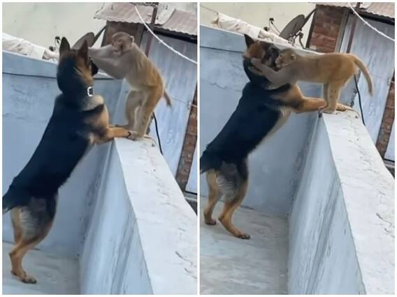 वायरल हो रही क्लिप में एक जर्मन शेफर्ड डॉग को घर की छत पर दीवार से लगकर खड़े होते देखा जा सकता है. तभी सामने के घर की छत पर मौजूद दो बंदरों में से एक बंदर उस कुत्ते के पास आने लगता है. कुत्ते के पास आकर वह बंदर उसके माथे को पकड़ता है, जिसके बाद उसे सहलाता है और फिर उसकी आंखों में देखने लगता है, इसके बाद बंदर को कुत्ते के माथे को चूमते देखा जा रहा है.