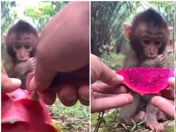 वायरल वीडियो में देखा जा सकता है कि एक बंदर का बच्चा अपना अंगूठा चूस रहा होता है. तभी वहां एक शख्स ड्रैगन फ्रूट लेकर आता है. शख्स फ्रूट काटता है और उसे बंदर के बच्चे को देता है. बंदर का बच्चा पहले तो फ्रूट नहीं खाता. जब शख्स उसे खाकर दिखाता है तो बेबी मंकी भी पहली बार ड्रैगन फ्रूट ट्राई करता है. उसे फ्रूट इतना पसंद आता है कि वो फिर उसे छोड़ता ही नहीं है. वो पूरा फ्रूट खाने की इच्छा जताता है. आप भी देखिए ये मनमोहक वीडियो.