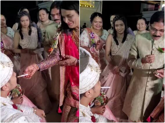 वहीं सोशल मीडिया पर सामने आई वीडियो में एक दूल्हे को शादी के दौरान उसकी सास और ससूर सिगरेट पिला कर उसका स्वागत करते नजर आ रहे हैं. ऐसी अनोखी परंपरा देख यूजर्स ने अपना माथा पकड़ लिया है. वीडियो में दूल्हे को कुर्सी पर बैठे देखा जा रहा है. उसी दौरान उसकी सास उसके मुंह में एक सिगरेट लगाती है और उसके बाद ससुर माचिस की तीली से उसकी सिगरेट को सुलगाते दिख रहा है.