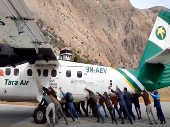 Plane Pushed By Passengers: दो पहिए और चार पहिए गाड़ी को धक्का लगाते हुए तो आपने बहुत देखा होगा, लेकिन विमान को धक्का लगाते हुए लोगों की तस्वीर शायद कभी नहीं देखी होगी. यह वायरल वीडियो नेपाल के बाजुरा विमानस्थल का है, जहां बुधवार को तारा एयरलाइन्स के विमान को दर्जनों लोग मिलकर धक्का लगा रहे हैं.