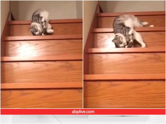 वीडियो में आपने देखा कि एक सफेद रंग की बिल्ली बड़े मजे से लेटे-लेटे ही सीढियां धीरे धीरे उतर रही है. उसको देखकर ऐसा प्रतीत होता है कि ये बिल्ली सो रही थी और मजबूरी में जब इसको सीढियां उतरनी पड़ी तो उसने बिना उठे ही नीचे जाने का फैसला किया होगा.