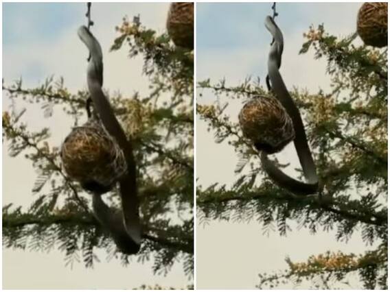 वायरल हो रही क्लिप में घने जंगलों के बीच कंटीले पेड़ पर जहरीले सांप को एक पक्षी के घोंसले पर अटैक करते देखा जा रहा है. आमतौर पर पक्षी जंगलों में शिकारी जानवरों से अपने घोंसलों को बचाने के लिए पेड़ की सबसे ऊंची डाल पर घोंसले बनाते हैं. वहीं वीडियो में सांप को ऊंचाई तक पहुंच घोंसले में घुसकर शिकार करते देखा जा रहा है.