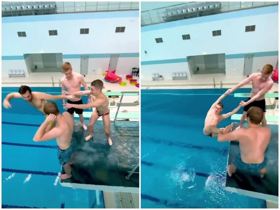 प्रैंक करना शख्स को पड़ा भारीवीडियो में देखा जा सकता है कि तीन लोग एक स्वीमिंग पूल के जंपिंग हेड पर खड़े हैं. एक शख्स पीछे से आता है और बीच में खड़े लड़के को पानी में धक्का दे देता है. यहां तक सब ठीक चल रहा है. लेकिन तभी उसके दोनों साथियों को गुस्सा आ जाता है और वो उस शख्स को पकड़कर पूल की तरफ झूला झुलाने लगते हैं. शख्स को झुलाते झुलाते यह वीडियो खत्म होता है. वीडियो को देखकर लगता है कि अंत में शख्स को पानी में ही फेंक दिया गया होगा. इस वीडियो को देखकर ये तो साफ समझ आता है कि प्रैंक करना कई बार खुद पर ही भारी पड़ जाता है. आप भी देखिए यह प्रैंक का वीडियो.