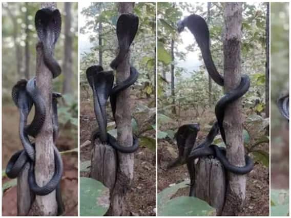 Cobras In Maharashtra Forest: भारत के जंगल विविध अजूबों से भरे हुए हैं. यहां अक्सर आपको ऐसी चीजें देखने को मिल जाएगी जो आपके होश उड़ाने के लिए काफी है. जंगलों में अक्सर हम ऐसे अद्भुत नजारे देखते हैं जो हमारी सांसें रोक सकती है. दरअसल महाराष्ट्र के जंगलों में तीन कोबरा की एक तस्वीर सोशल मीडिया पर वायरल हो रही है. इस तस्वीर में तीन कोबड़ा एक साथ लहराते दिख रहे हैं. मिली जानकारी के अनुसार यह दुर्लभ तस्वीर (Rare picture) महाराष्ट्र के मेलघाट (Melghat) के जंगल की है. इस तस्वीर में साफ देखा जा सकता है कि कैसे तीन बड़े कोबरा सांप (cobra snake) एक पेड़ पर एक दूसरे से लिपटे हुए हैं. तस्वीर में ये कभी एक दूसरे से लिपटते नजर आ रहे हैं तो कभी फन फैलाकर खड़े हो जाते.