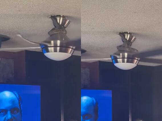 वीडियो में देखा जा सकता है कि एक शख्स मजे से टीवी देख रहा है. जब उसे पंखे पर सांप नजर आता है तो वो उसकी वीडियो कैप्चर करने लग जाता है. सांप पंखे की रोड में लिपटा हुआ है. जब वो हिल-डुलकर नीचे उतरने की कोशिश करता है तो चलते पंखे के ब्लेड से उसका सिर कई बार टकराता है. सांप को टकराते देखकर ऐसा लगता है कि बस अब उसका काम तमाम हो जाएगा. हालांकि कुछ सेकंड के लिए सांप पीछे हटता है और फिर वापस ब्लेड की तरह घूम जाता है.