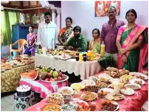 Groom Welcome With 365 Dishes: दुनिया भर में भारत अपनी संस्कृति और सभ्यता के लिए पहचाना जाता है. भारत में मेहमानों को भगवान का दर्जा दिया जाता है और जब बात घर के दामाद की हो तो कहने ही क्या. दामाद के ससुराल में आने की खबर के साथ ही रसोई घर से तरह तरह के पकवानों की खुशबू आने लगती है. दामाद की मेहमान नवाजी और खातिरदारी हर कोई अपने स्तर से ऊपर उठ कर शाही ठाठ बाट के साथ करना चाहता है. ऐसा ही एक मामला आंध्र प्रदेश के पश्चिम गोदावरी जिले के नरसापुरम में देखने को मिला. यहां दामाद के स्वागत में ससुराल वालों ने 365 भोज तैयार कर दिए.