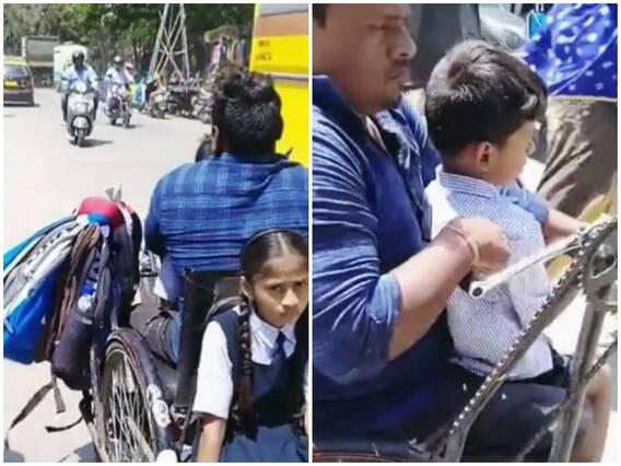 वायरल हो रहे इस वीडियो आईएएस अधिकारी सोनल गोयल ने ट्विटर पर शेयर किया है जिसमें एक दिव्यांग शख्स अपनी तिपहिया साइकिल को खींचते देखा जा रहा है. इसके पीछे स्कूल यूनिफॉर्म पहने उसकी बेटी और आगे उसकी गोद में उसका बेटा बैठे दिख रहे हैं. वह स्कूल छोड़ने के लिए जाते देखा जा रहा है.