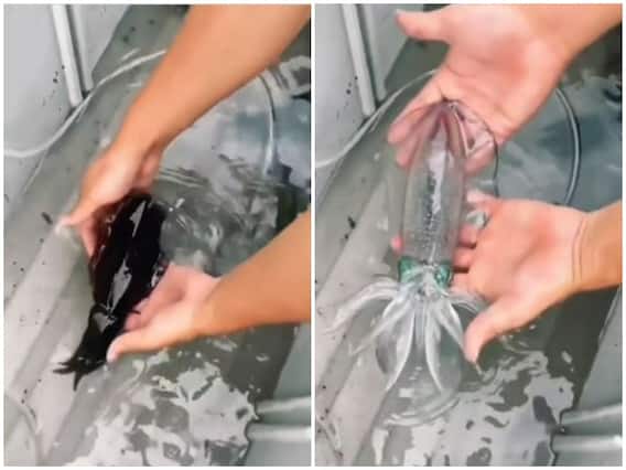 समुद्र में रहने वाले कुछ जीव बचने के लिए शिकारी जीवों पर हमला करने के बजाए खुद को छुपाने में माहिर होते हैं. समुद्र में पाए जाने वाले 8 पैरों वाले ऑक्टोपस को अक्सर अपने आस-पास की चीजों में ढलकर छुपते देखा जाता है. वहीं हाल ही में सामने आया स्कविड पानी में नीले रंग का दिख रहा है. जैसे ही उसे एक शख्स अपने हाथ में उठा रहा है तो वह खुद को गायब करने के लिए ट्रांसपेरेंट हो जा रहा है.