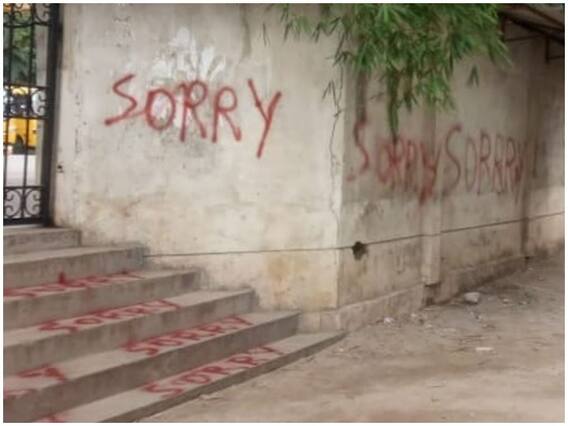 दरअसल, कर्नाटक के बेंगलुरू में एक अजीबोगरीब घटना हुई. यहां एक स्कूल के बाहर सीढ़ियों, दीवारों और सड़क पर किसी ने लाल रंग से Sorry लिखकर भर दिया. बड़े-बड़े लाल अक्षरों में लिखा Sorry हर किसी को हैरान कर रहा है कि आखिर ये काम किसने और क्यों किया? वहीं इस मामले की जानकारी पुलिस को भी दे दी गई है और पुलिस मामले की जांच कर रही है.