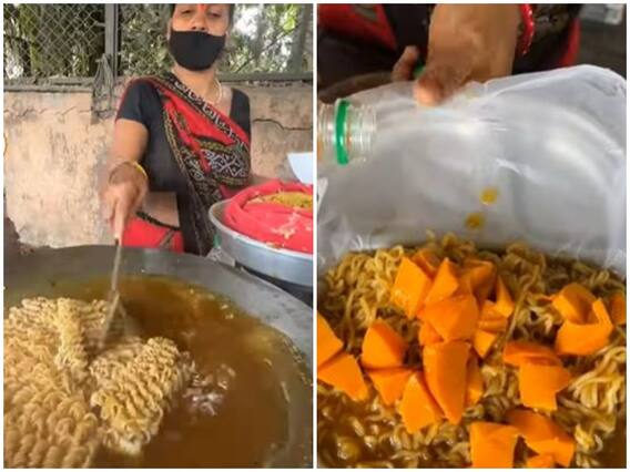 जैसे ही मैगी थोड़ा पक जाती है तो यह महिला यहां पर सभी को हैरत में डालते हुए उसमें मैंगो ड्रिंक मिला देती है. जिसके बाद मैगी के पकने पर वह उसके ऊपर आम के छोटे-छोटे टुकड़े कर सर्व मैंगो ड्रिंक के साथ सर्व करती नजर आती है. जिसे देख सोशल मीडिया यूजर्स काफी भड़क गए हैं.