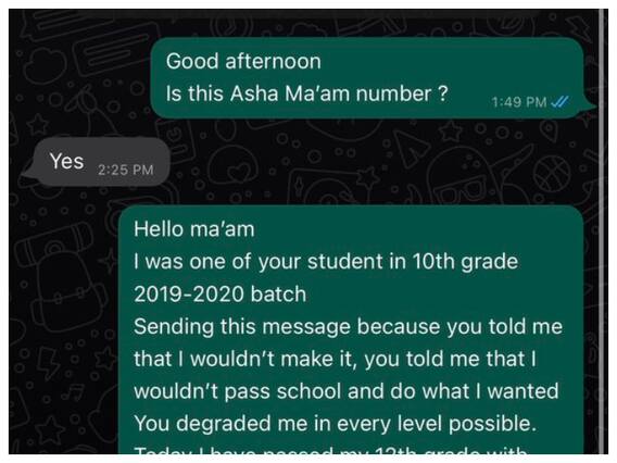 अपनी इसी बात को अपनी ट्यूशन टीचर तक पहुंचाने के लिए ट्विटर यूज़र ने उनको मेसेज किया और उसका स्क्रीनशॉट सोशल मीडिया पर शेयर किया. ये मेसेज इस छात्र ने अपनी ट्यूशन टीचर को ये बताते हुए किया कि उनके मनोबल गिराने वाले शब्दों के बावजूद उसने अपनी 12वीं की परीक्षा पास कर ली है.