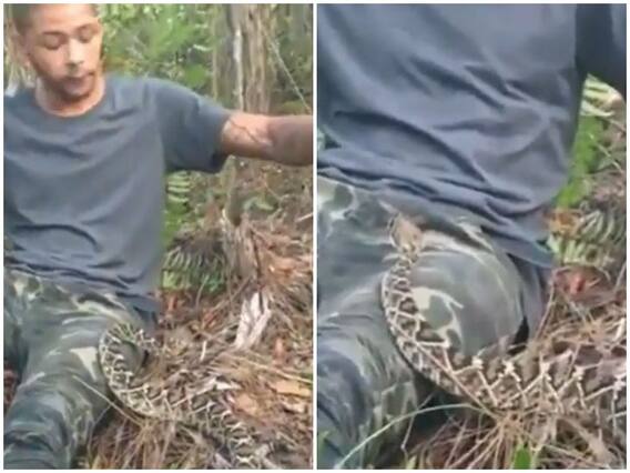 दरअसल वीडियो को देककर पता चलता है कि एक जंगल में घुमने के दौरान शख्स जमीन पर बैठ जाता है. वह इस बात से बिल्कुल अंजान होता है कि आसपास सांप हो सकते हैं. इसी दौरान एक सांप उसकी गोद में आ जाता है. जिसके बाद वह शख्स एक लकड़ी की मदद से उसे दूर करने के लिए छूता है.