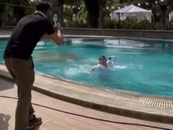 स्विमिंग पूल (Swimming Pool) में गिरने के बाद सनी लियोनी काफी हैरान हो जाती हैं और बदला लेने की तैयारी करती हैं. वीडियो में आप देख सकते हैं कि सनी अपने दोस्त को चप्पल निकाल कर मारने लगती हैं.