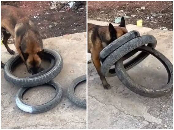 वीडियो में देखा जा सकता है कि डॉगी का मालिक उसके सामने चार टायर निकाल कर रख देता है. जिसके बाद टायरों को देखकर एक अच्छा खासा आइडिया निकालता है और उस पर वर्क करते हुए एक एक कर सभी टायर को एक दूसरे के ऊपर रख उन्हें एक साथ ले जाने का जुगाड़ निकाल लेता है.