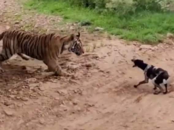 सोशल मीडिया (Social Media) पर बाघ और कुत्ते (Dog) का वीडियो तेजी से वायरल (Viral Video) हो रहा है. अब ये बात जगजाहिर है कि बाघ से तो बड़े-बड़े खूंखार जानवर भी डरते हैं ऐसे में डेढ़ पसली वाले एक कुत्ते की क्या औकात, लेकिन जरा सोचिए कि अगर कोई दुबला-पतला सा कुत्ता, टाइगर पर भौंकने की हिमाकत कर दे तो फिर उसका अंजाम क्या होगा?