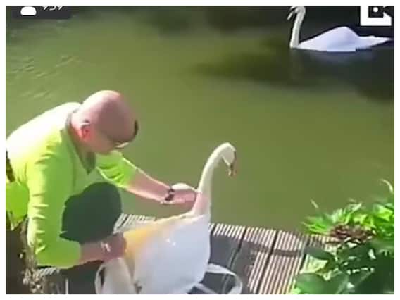 वायरल वीडियो में ऐसे ही एक हंस के जोड़े को दिखाया गया है जो बिछड़ गए थे. दरअसल वीडियो में एक आदमी को दिखाया गया है जो पानी के किनारे बैठकर एक हंस को खोल रहा होता है. वीडियो में बताया गया है कि ये हंस जख्मी हो गया था और अब इलाज से ठीक होने बाद ये फिर से अपने साथी से मिल रहा है. वो आदमी जैसे ही हंस को छोड़ता है, वो हंस पहले से पानी में मौजूद अपने साथी हंस के पास चला जाता है. दोनों को आपस में मिलते देखना यूजर्स को बहुत हसीन लगता है. वीडियो में बाद में दोनों हंसों को पानी में साथ साथ तैरते देखा जा सकता है.