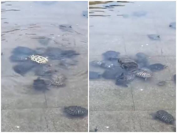 दरअसल सोशल मीडिया पर सामने आए एक वीडियो में कुछ कछुओं को पानी के अंदर मस्ती करते देखा जा रहा है. जहां पर एक कछुआ तालाब में पानी का लेवल कम होने के कारण पलट जाता है और फिर खुद को सीधा नहीं कर पाता है. जिसके कारण उसे काफी मुश्किल का सामना करना पड़ सकता है. लेकिन इसी दौरान हम तालाब में कुछ अलग होता देखते हैं.