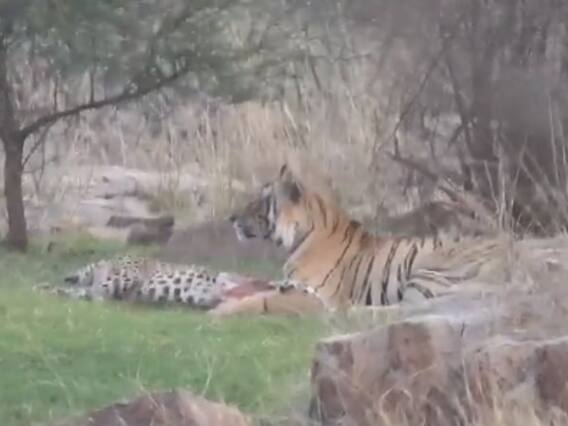 Tiger viral video: राजस्थान के सवाई माधोपुर स्थित रणथंभौर नैशनल पार्क में एक बाघ ने एक तेंदुए का शिकार कर उसे मार गिराया. इस ख़बर के साथ ही इसका वीडियो भी काफ़ी वायरल हो गया है, क्योंकि वीडियो में दिखाया गया है की कैसे एक टाइगर शान से लेपर्ड का लंच कर रहा है. आपको बता दें कि रणथंभौर नेशनल पार्क में अक्सर ही बाघों के बीच भिडंत देखने को मिल जाती है लेकिन शायद ही कभी किसी टाइगर की लेपर्ड के साथ ये भिडंत देखने को मिली होगी.