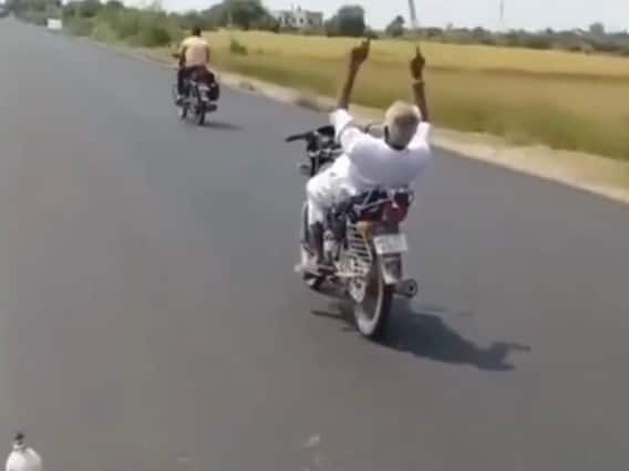 य़े वीडियो ट्विटर पर पोस्ट किया गया है और इसमें आप देख सकते हैं कि सफेद कुर्ता पजामा पहन कर सफेद दाढ़ी वाले अंकल टाइप चचा क्या गुल खिला रहे हैं. चचा कभी बाइक के हैंडल से हाथ हटा कर ऊपर हिला रहे हैं. फिर वो बाइक पर पीछे लेट जाते हैं और फिर बाइक पर ही हाथ उठा कर बल्ले बल्ले करना शुरु कर देते हैं. बाइक के पीछे से आ रहे किसी शख्स ने इस वीडियो को रिकॉर्ड करके सोशल मीडिया पर डाला तो ये वायरल हो गया है. देखा जाए तो ये वीडियो खतरनाक तो ही है, साथ ही ये भी बता रहा है कि सोशल मीडिया पर लाइक्स पाने की अंधी दौड़ में लोग किस कदर लापरवाह हो गए हैं.