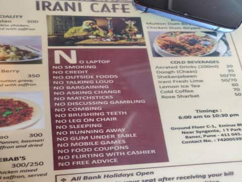 जिस तरीके से सोशल मीडिया पर अजीबों गरीब चीजें वायरल होती रहती है, तो इसमें कोई हैरानी वाली बात नहीं है कि किसी कैफे या रेस्टोरेंट का मेनू कार्ड भी वायरल हो सकता है. इस समय ट्वीटर पर पुणे में कैफे ‘ईरानी कैफे’ का मैन्यू कार्ड की तस्वीर सोशल मीडिया पर जोरों से वायरल हो रही है. उस वायरल मैन्यू कार्ड की तस्वीर में लिखा है कि “क्या नहीं करना है” जैसे कि नो लैपटॉप, नो स्मोकिंग, नो क्रेडिट और नो बारगेनिंग. तो वहीं इस वायरल तस्वीर को लेकर ट्वीटर यूजर्स मनोरंजन के लिए मीम्स औऱ चुटकुले बना दिए है.