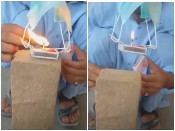 वायरल हो रहे इस वीडियो में आप देखेंगे कि एक लड़का फ्रेम में बैठा हुआ है. उसने अपने सामने 2 ईंटें एक के ऊपर एक करके लगा रखीं हैं. इन दोनों ईंटों के ऊपर एक माचिस रखी है. इस माचिस के दोनों ओर इसने 2-2 तीली लगा रखी है जो जिनका कुछ हिस्सा सपोर्ट के लिए अंदर है और कुछ बाहर निकला हुआ है. इन तीली के सहारे 1 मास्क को फंसाया गया है. मास्क का मुख्य सिरा ऊपर की ओर उठा हुआ है, जबकि नीचे माचिस और मास्क के बीच काफी गैप है. यानी ये साफ दिखता है कि मास्क को ऊपर किसी धागे के सहारे उठाया गया है, क्योंकि मास्क अपने आप ऊपर की तरफ उठेगा नहीं.
