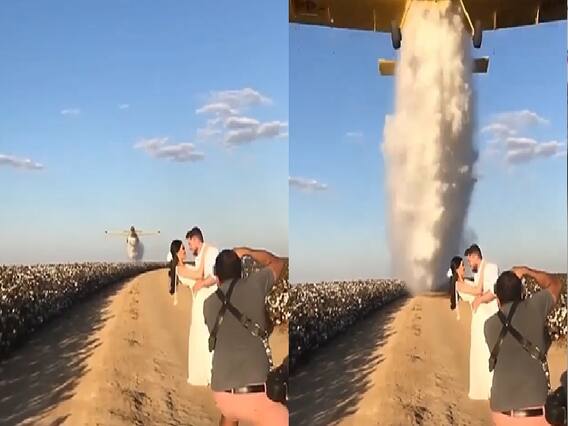 इस वीडियो में आप देख सकते हैं कि दूल्हा, दूल्हन और कैमरामैन बिल्कुल तैयार खड़े हैं. दुल्हन ने खूबसूरत सफेद गाउन पहना है और दूल्हे ने भी बेहद रोमांटिक अंदाज में पोज दे रहा है. लेकिन, जैसे ही उनके सिर से प्लेन गुजरता है सभी की हालत देखने वाली होती है. सभी धुएं में छिप जाते हैं. बाद में तीनों ही हंसने लगते हैं. बता दें कि इस बेहद मजेदार वीडियो को इंस्टाग्राम (Instagram) पर bride_buzz नाम के अकाउंट से शेयर किया है. इस वीडियो को अब तक 8.2 मिलियन से ज्यादा व्यूज मिल चुके हैं. लोग इसपर बेहद मजेदार रिएक्शन दे रहे हैं.