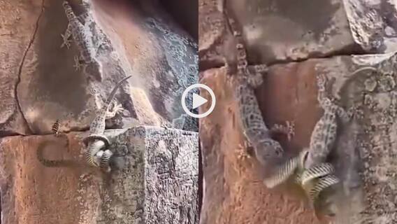 Two lizards Video: सोशल मीडिया पर एक ऐसा वीडियो वायरल हो रहा है जिसे देखकर हर कोई हैरान है. यह वीडियो इंसानों की नहीं, बल्कि जानवरों की दुनिया से जुड़ा है. वीडियो में देखा जा सकता है कि एक पत्थर की बड़ी चट्टान पर एक सांप ने एक लिजार्ड को अपने कब्जे में कर रखा है. सांप ने उसे कसकर जकड़ लिया था और धीरे-धीरे उसे निगलने की कोशिश कर रहा था.