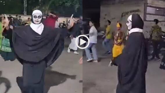 वायरल वीडियो में साफ देखा जा सकता है कि महिला ने काले रंग का बुर्का पहन रखा है और चेहरे पर डरावना मेकअप किया गया है, जिससे वह किसी जोंबी या चुड़ैल जैसी नजर आ रही थी. मंच पर मौजूद अन्य कलाकार गरबे की पारंपरिक पोशाक में थे, लेकिन महिला की वेशभूषा और लुक ने सभी का ध्यान अपनी ओर खींच लिया.