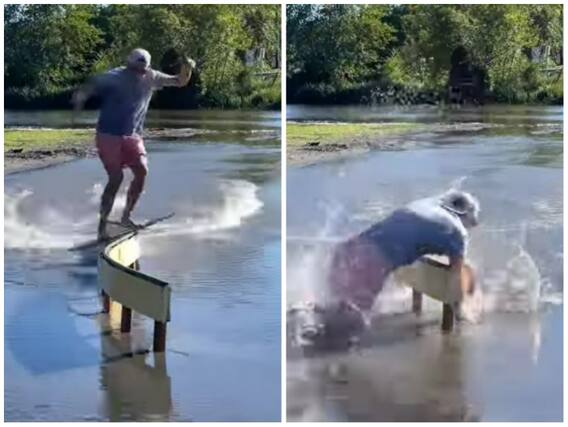 फिलहाल वायरल हो रहे वीडियो को सोशल मीडिया पर फेल फ्रेंजी नाम के इंस्टाग्राम पेज पर शेयर किया गया है. इसमें एक शख्स नदी किनारे पर सर्फिंग बोर्ड हाथ में लिए तेजी से आते देखा जा रहा है. जिसे वह पानी में गिरा कर उस पर सवार हो जाता है. आगे देखा जा रहा है कि वह सर्फिंग बोर्ड को पैरों से उछालकर एक प्लेटफॉर्म पर चढ़ाने की कोशिश करता है.