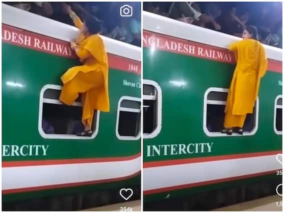 वायरल वीडियो में आपने भीड़ वाली ट्रेन की छत पर चढ़ने की कोशिश करती एक महिला को देखा और आगे जो हुआ उसे देखकर आपकी हंसी नहीं रुकी होगी. महिला जैसे ही सिपाही को देखती है उसकी सिट्टी-बिट्टी गुम हो जाती है और वापस प्लेटफॉर्म पर आ जाती है. वीडियो को इंस्टाग्राम पर विद्याधर जेना ने शेयर करते हुए लिखा है कि, 'बांग्लादेश के एक रेलवे स्टेशन पर एक और दिन "