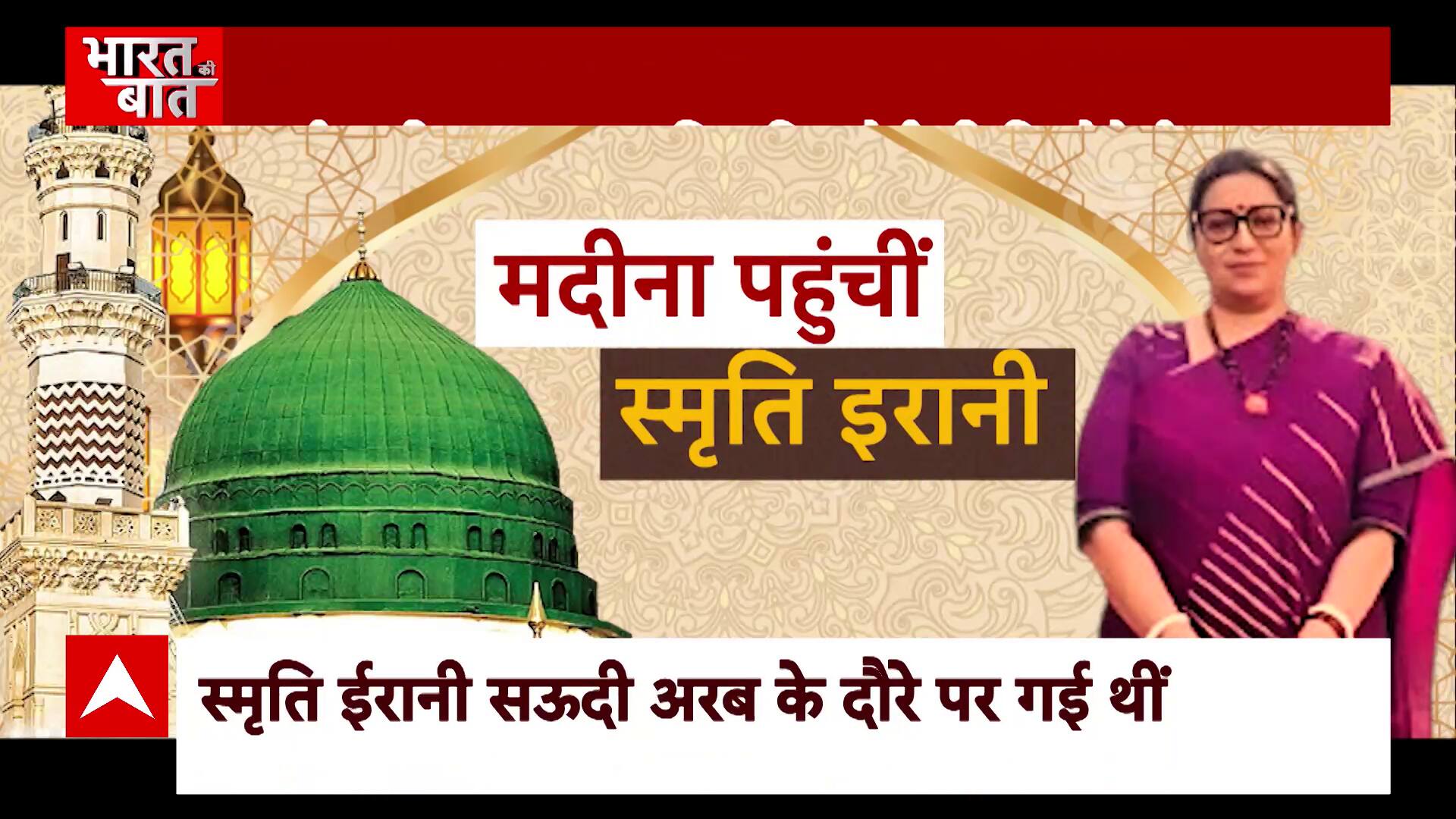 मदीना.. ये नाम सुनते ही जहन में इस्लाम धर्म के दूसरे सबसे पवित्र शहर की तस्वीर कौंध जाती है। मदीना वो शहर है जहां पैगंबर मोहम्मद ने दुनिया की सबसे बड़ी मस्जिद की बुनियाद रखी थी। इसी मदीना शहर में जब भारत की महिला और अल्पसंख्यक मामलों की मंत्री स्मृति ईरानी पहुंची तो पूरी दुनिया में चर्चा होने लगी। स्मृति ईरानी ने मदीना की मस्जिदों का भी दौरा किया। स्मृति ईरानी की मदीना दौरे वाले तस्वीर सोशल मीडिया पर पहुंची तो वायरल हो गई। एक धड़ा इस दौरे को ऐतिहासिक बता रहा है तो दूसरा धड़ा स्मृति के सिर ना ढकने पर आलोचना कर रहा है। भारत की बात में मेरे साथ आज देखिए मोदी की मंत्री के मदीना पहुंचने और वहां से आई इन तस्वीरों के असली मायने क्या हैं?