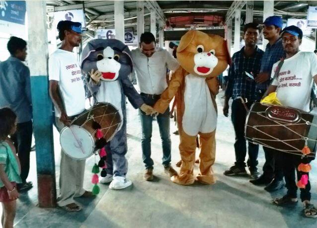 वाराणसी कैंट स्टेशन पर लोगों को स्वच्छता का संदेश देने उतरे कार्टून कैरैक्टर 'टॉम एंड जेरी'