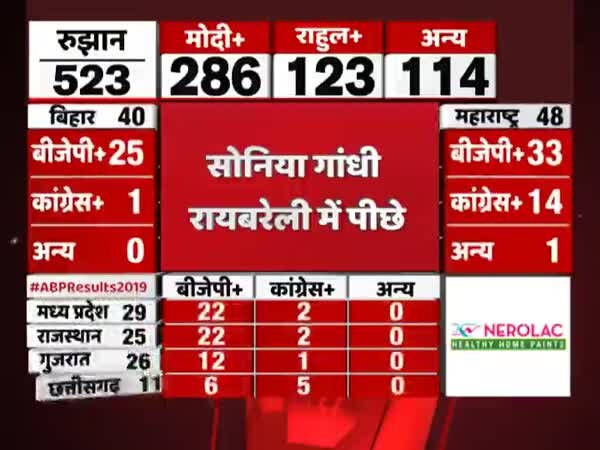 रुझानों के बीच उत्तर प्रदेश से बहुत बड़ी खबर सामने आ रही है. रायबरेली सीट से सोनिया गांधी 600 वोटों से पीछे चल रही हैं. वहीं कांग्रेस अध्यक्ष राहुल गांधी अमेठी में 6000 वोटों से पीछे चल रहे हैं.