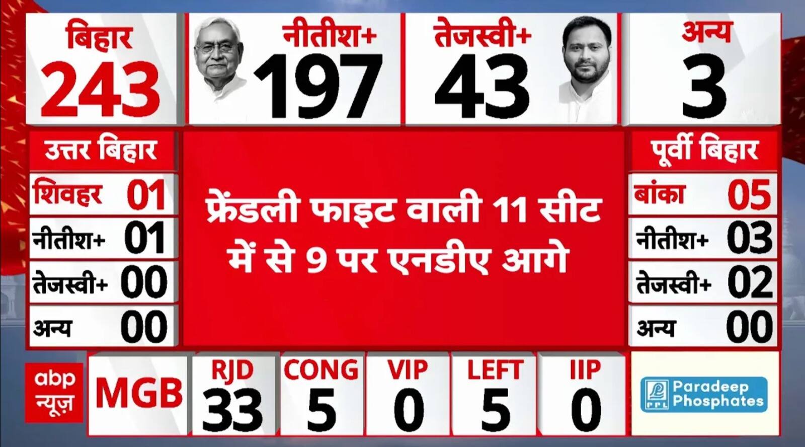 बिहार विधानसभा चुनाव संपन्न होने के बाद सभी राजनीतिक पार्टियों के उम्मीदवारों का भविष्य ईवीएम में बंद हो गया है, इसके बाद यह स्पष्ट हो जाएगा कि बिहार में किस गठबंधन की सरकार बनेगी.हालांकि, मतगणना से पहले बिहार चुनाव को लेकर सामने आए लगभग सभी एग्जिट पोल्स में भारतीय जनता पार्टी (BJP) के नेतृत्व वाले राष्ट्रीय जनतांत्रिक गठबंधन (NDA) को प्रचंड बहुमत मिलता दिखाई दे रहा है.बिहार की 243 विधानसभा सीटों पर मतदान के बाद आईएएनएस-मैटराइज के एग्जिट पोल्स के मुताबिक, एनडीए को 147 से 167 सीटें मिलेंगी, जबकि विपक्षी महागठबंधन को 70 से 90 सीटें मिलने का अनुमान है. CHANAKAYA STRATEGIES के मुताबिक, NDA को 130-138 सीट, महागठबंधन को 100-108 और अन्य को बिहार में 3-5 सीट मिल सकती है. वहीं, POLSTRAT के एग्जिट पोल में एनडीए को बिहार चुनाव 2025 में 133-148 सीटें, महागठबंधन को 87-102 सीटें और अन्य को 3-5 सीट मिलती हुई दिख रही हैं. TIF Research के एग्जिट पोल के मुताबिक, भाजपा के नेतृत्व वाले NDA को बिहार विधानसभा चुनाव में 145 से 163 सीटें मिल सकती हैं, जबकि महागठबंधन को 76-95 सीटें और अन्य को 3 से 6 सीटें हासिल हो सकती हैं. वहीं, POLL DIARY के आंकड़ों के मुताबिक, NDA को 184-209 सीटें मिल सकती हैं, महागठबंधन में 32-49 सीटें और अन्य को 1 से 5 सीटें मिलने की संभावना है