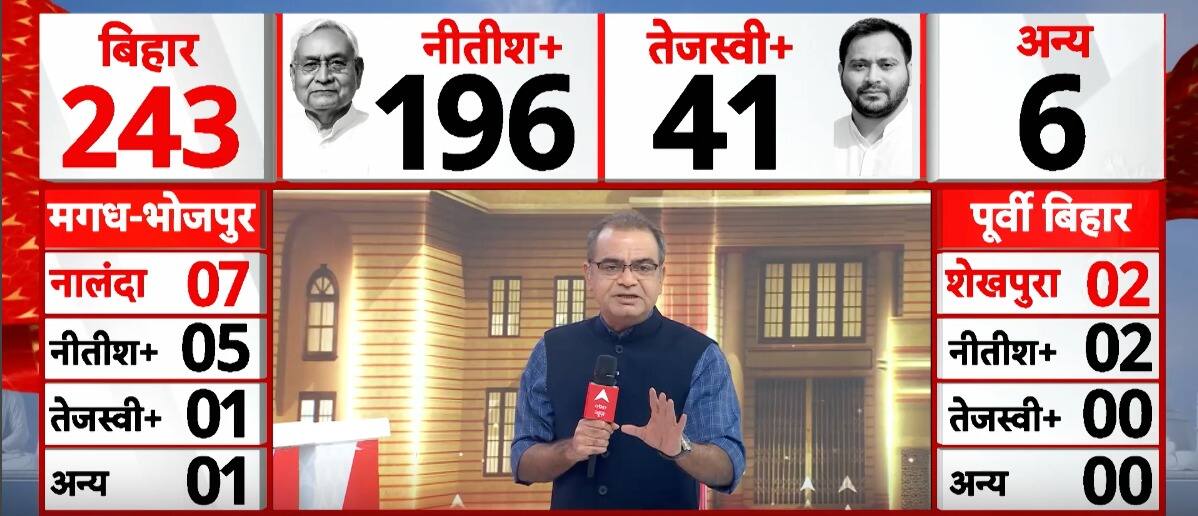 #BiharElection2025 #BiharElectionResult2025 #BiharResult2025 #ElectionResults2025 #BiharAssemblyElection #VoteCounting #Result2025 #ABPResult #BiharElectionResult #RJD #JDU #BJP #Congress #NDA #Mahagathbandhan #BiharPolitics #BiharNews #abpnews #abpnewslive #abpnewslivetv बिहार विधानसभा चुनाव संपन्न होने के बाद सभी राजनीतिक पार्टियों के उम्मीदवारों का भविष्य ईवीएम में बंद हो गया है, इसके बाद यह स्पष्ट हो जाएगा कि बिहार में किस गठबंधन की सरकार बनेगी.हालांकि, मतगणना से पहले बिहार चुनाव को लेकर सामने आए लगभग सभी एग्जिट पोल्स में भारतीय जनता पार्टी (BJP) के नेतृत्व वाले राष्ट्रीय जनतांत्रिक गठबंधन (NDA) को प्रचंड बहुमत मिलता दिखाई दे रहा है.बिहार की 243 विधानसभा सीटों पर मतदान के बाद आईएएनएस-मैटराइज के एग्जिट पोल्स के मुताबिक, एनडीए को 147 से 167 सीटें मिलेंगी, जबकि विपक्षी महागठबंधन को 70 से 90 सीटें मिलने का अनुमान है. CHANAKAYA STRATEGIES के मुताबिक, NDA को 130-138 सीट, महागठबंधन को 100-108 और अन्य को बिहार में 3-5 सीट मिल सकती है. वहीं, POLSTRAT के एग्जिट पोल में एनडीए को बिहार चुनाव 2025 में 133-148 सीटें, महागठबंधन को 87-102 सीटें और अन्य को 3-5 सीट मिलती हुई दिख रही हैं. TIF Research के एग्जिट पोल के मुताबिक, भाजपा के नेतृत्व वाले NDA को बिहार विधानसभा चुनाव में 145 से 163 सीटें मिल सकती हैं, जबकि महागठबंधन को 76-95 सीटें और अन्य को 3 से 6 सीटें हासिल हो सकती हैं. वहीं, POLL DIARY के आंकड़ों के मुताबिक, NDA को 184-209 सीटें मिल सकती हैं, महागठबंधन में 32-49 सीटें और अन्य को 1 से 5 सीटें मिलने की संभावना है