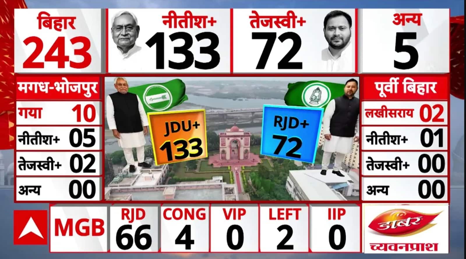 बिहार विधानसभा चुनाव संपन्न होने के बाद सभी राजनीतिक पार्टियों के उम्मीदवारों का भविष्य ईवीएम में बंद हो गया है, इसके बाद यह स्पष्ट हो जाएगा कि बिहार में किस गठबंधन की सरकार बनेगी.हालांकि, मतगणना से पहले बिहार चुनाव को लेकर सामने आए लगभग सभी एग्जिट पोल्स में भारतीय जनता पार्टी (BJP) के नेतृत्व वाले राष्ट्रीय जनतांत्रिक गठबंधन (NDA) को प्रचंड बहुमत मिलता दिखाई दे रहा है.बिहार की 243 विधानसभा सीटों पर मतदान के बाद आईएएनएस-मैटराइज के एग्जिट पोल्स के मुताबिक, एनडीए को 147 से 167 सीटें मिलेंगी, जबकि विपक्षी महागठबंधन को 70 से 90 सीटें मिलने का अनुमान है. CHANAKAYA STRATEGIES के मुताबिक, NDA को 130-138 सीट, महागठबंधन को 100-108 और अन्य को बिहार में 3-5 सीट मिल सकती है. वहीं, POLSTRAT के एग्जिट पोल में एनडीए को बिहार चुनाव 2025 में 133-148 सीटें, महागठबंधन को 87-102 सीटें और अन्य को 3-5 सीट मिलती हुई दिख रही हैं. TIF Research के एग्जिट पोल के मुताबिक, भाजपा के नेतृत्व वाले NDA को बिहार विधानसभा चुनाव में 145 से 163 सीटें मिल सकती हैं, जबकि महागठबंधन को 76-95 सीटें और अन्य को 3 से 6 सीटें हासिल हो सकती हैं. वहीं, POLL DIARY के आंकड़ों के मुताबिक, NDA को 184-209 सीटें मिल सकती हैं, महागठबंधन में 32-49 सीटें और अन्य को 1 से 5 सीटें मिलने की संभावना है
