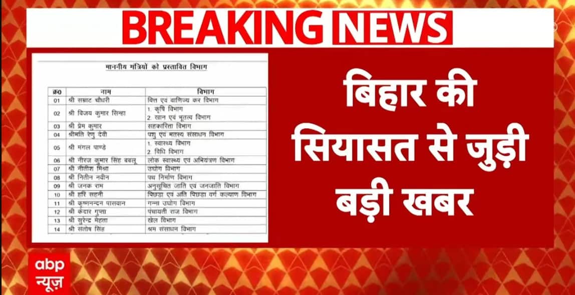 कल बिहार में बीजेपी कोटे से 7 नए मंत्री नीतीश मंत्रिमंडल में शामिल हुए और बीजेपी कोटे के सभी मंत्रियों के विभाग बदल दिए गए हैं....डिप्टी सीएम सम्राट चौधरी के विभाग में कोई बदलाव नहीं किया गया है...डिप्टी सीएम विजय सिन्हा के पास अब कृषि विभाग, खान एवं भूतत्व विभाग होगा...विजय सिन्हा के पास पहले पथ निर्माण मंत्रालय था....नए मंत्री संजय सरावगी को दिलीप जायसवाल वाला राजस्व और भूमि सुधार मंत्रालय दिया गया है....जीवेश मिश्रा को नगर विकास मिला जो पहले नितिन नवीन के पास था....नितिन नवीन को पथ निर्माण मिला है...ये पहले विजय सिन्हा के पास था...HAM पार्टी से मंत्री संतोष सुमन का विभाग भी बदला गया