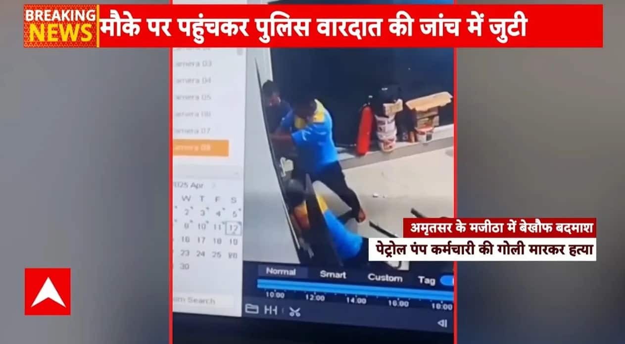 अमृतसर के मजीठा में बेखौफ बदमाशों की खौफनाक करतूत सामने आई है....यहां के कलेर मंगट गांव में 3 हथियारबंद बदमाश एक पेट्रोल पंप पर लूट के इरादे से दाखिल हुए...इस दौरान पेट्रोल पंप कर्मचारियों ने बदमाशों को रोकने की काफी कोशिश की...इस दौरान बदमाशों ने गोली चला दी....जिससे एक पेट्रोल पंप कर्मचारी की मौत हो गई जबकि दूसरा कर्मचारी घायल हो गया.....घटना रविवार रात की बताई जा रही है....पेट्रोल पंप पर हत्या की ये घटना CCTV में कैद हो गई....सूचना पाकर पुलिस मौके पर पहुंची और वारदात की पड़ताल में जुट गई...