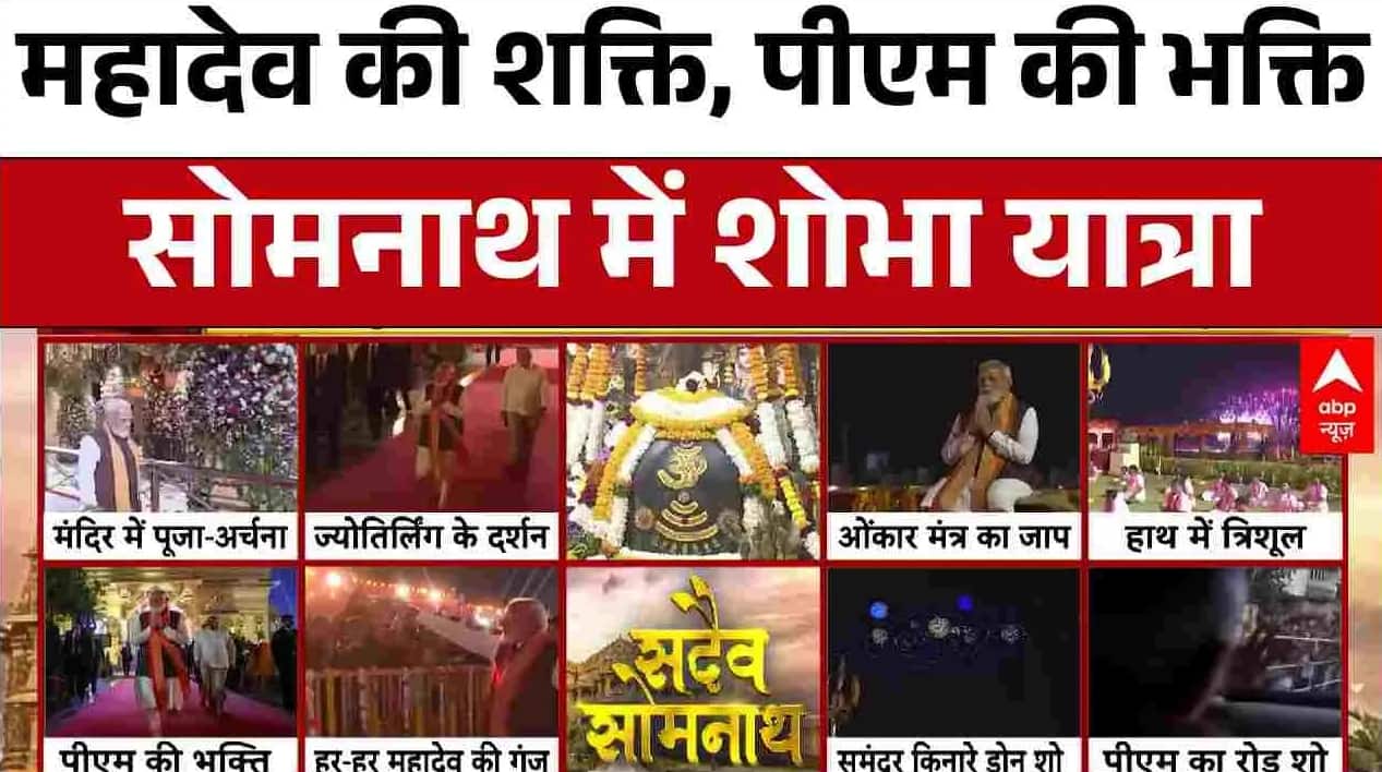 प्रधानमंत्री नरेंद्र मोदी अपने दौरे के दूसरे दिन आज रविवार को गुजरात स्थित सोमनाथ मंदिर में मनाए जा रहे ‘सोमनाथ स्वाभिमान पर्व’ के तहत शौर्य यात्रा में शामिल होंगे। उन्होंने रविवार को कहा कि सोमनाथ मंदिर शाश्वत दिव्यता का प्रतीक है और पीढ़ियों को मार्गदर्शन देता रहता है। प्रधानमंत्री मोदी ने सुबह सोशल मीडिया प्लेटफॉर्म ‘एक्स’ पर एक वीडियो शेयर किया, जिसमें शनिवार के कार्यक्रमों की कुछ झलकियों शामिल हैं। प्रधानमंत्री मोदी ने लिखा, “सोमनाथ शाश्वत दिव्यता का प्रतीक है। इसकी पवित्र उपस्थिति पीढ़ियों से लोगों का मार्गदर्शन करती आ रही है। शनिवार के कार्यक्रमों की कुछ झलकियां यहां शेयर की हैं, जिनमें ओंकार मंत्र का जाप और ड्रोन शो शामिल है।”