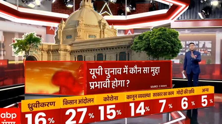यूपी चुनाव में कौन सा मुद्दा प्रभावी होगा ? ध्रुवीकरण - 16 % किसान आंदोलन- 27 % कोरोना- 15 % कानून व्यवस्था- 14 % सरकार का काम- 7 % मोदी की छवि- 6 % अन्य- 5 %