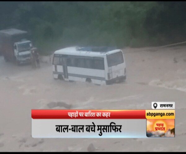 रामनगर :पहाड़ों पर बारिश का कहर,बरसाती नाले में फंसी बस