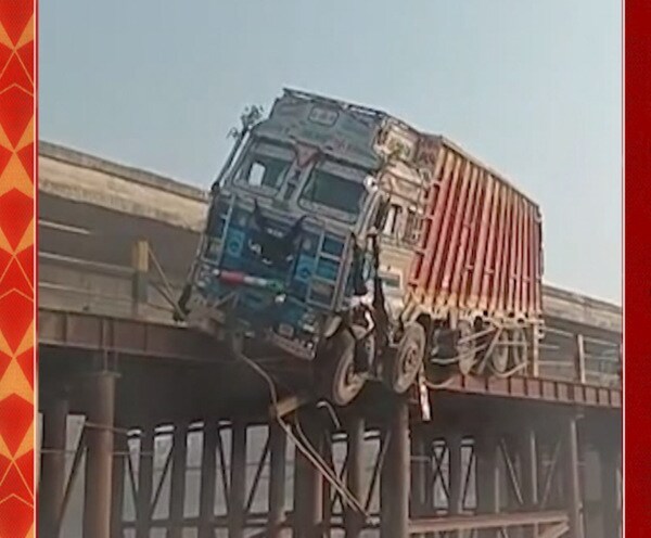 • UP के चंदौली में पुल से नीचे लटका ट्रक