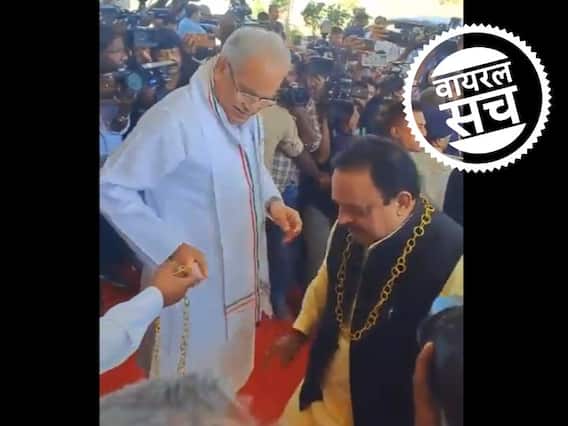 Bhupesh Baghel Gold Chain: राजनीति के खेल में एक दूसरे के खिलाफ आरोप-प्रत्यारोप आम बात है, हालांकि कई बार ऐसा देखा गया है कि विरोधी के खिलाफ सोशल मीडिया पर कुछ ऐसी बातें फैलाई जाती हैं, जिनका सच्चाई से दूर-दूर तक कोई वास्ता नहीं होता. ऐसा ही एक मामला छत्तीसगढ़ के रायपुर से सामने आया है. जहां कांग्रेस के 85वें अधिवेशन में सीएम भूपेश बघेल ने तमाम पार्टी नेताओं का स्वागत किया. इसका एक वीडियो सोशल मीडिया पर खूब वायरल हो रहा है. जिसमें दावा किया जा रहा है कि कांग्रेस नेताओं को भूपेश बघेल सोने की मोटी चेन पहना रहे हैं.