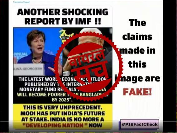 खुद पीआईबी की तरफ से इसका फैक्ट चेक किया गया. पीआईबी पर सरकार ने साफ किया है कि इस वायरल ट्विट में झूठा दावा किया जा रहा है कि IMF के नवीनतम विश्व आर्थिक आउटलुक के अनुसार भारत 2025 तक बांग्लादेश से अधिक गरीब होगा और अब विकासशील देश नहीं रहेगा.